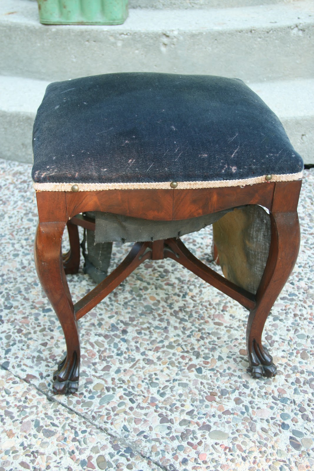And that’s probably what led to my next purchase, in which I can only assume that my mind was taken over by some sort of alien auction mind sucker. But basically I saw this little stool (the auctioneer described it as a piano bench, but my mom tells me it was probably an organ bench) and knew it had to be ancient. The upholstery is obviously in really bad shape but it’s incredibly sturdy. There is a chip out of the veneer in one spot but otherwise the wood is in good shape. I truly have no idea what I’ll do with this. I paid $10.