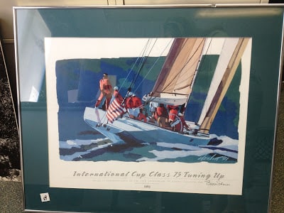 In the funniest moment of the day I also picked up a print and a photograph of sailboats. The print was actually DeWitt print commemorating the 25th anniversary of the magazine and it was signed by my dad (the publisher). The photo was an old photo of one of my family’s sailboats. My parents and grandmother are in it. First I thought I’d pick them up because no one else would want them. Then I thought that it would be really weird to have these things hanging in another person’s house. They combined them into one lot and for a minute there it looked like I was going to get both for $5. And then the auctioneer made a big fuss that the print was signed (um, may I point out not by the artist!) and suddenly a guy started bidding against me and the next thing you knew I was paying $60 for to pieces of art I could probably find in my parents’ basement if I looked hard enough. Oh well.