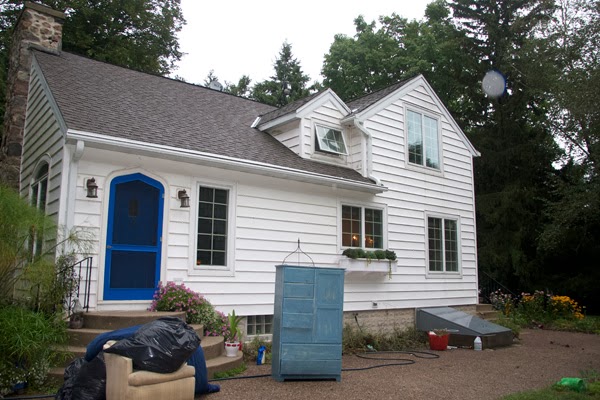 Here’s the first blue I used way back when, as seen in this photo from the day we started our renovation as we were literally moving out of the house (hence the furniture on the patio). It was really blue. This is also a good picture of how odd the front door looked before we added the portico.