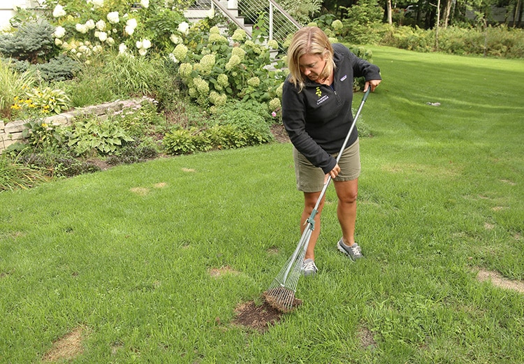 We also overseed on occasion, just to help fill in slightly bare spots. Do this by simply spreading seed (I usually use a handheld broadcast spreader for this), and then making sure the lawn is watered so the seed germinates.