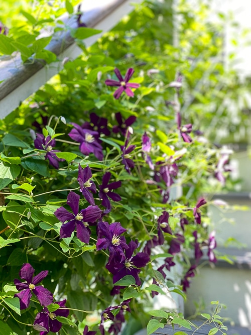 ‘Etoile Violette’ grows up the stair railing and is one of the clematis I think everyone should have. It blooms so prolifically and asks so little: just a bit of fertilizer, maybe some water and a hard cut back in spring.