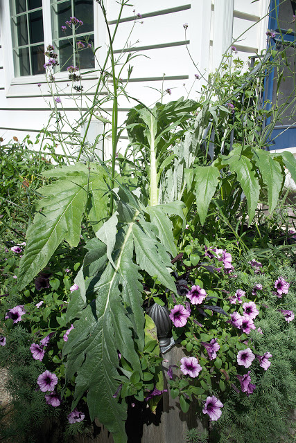 The cardoon was a droopy mess, as were the verbena in the large container by the front door. The cardoon will be fine, but I may have to prune out the floppy verbena. No worries, it will send up new flowers in no time.