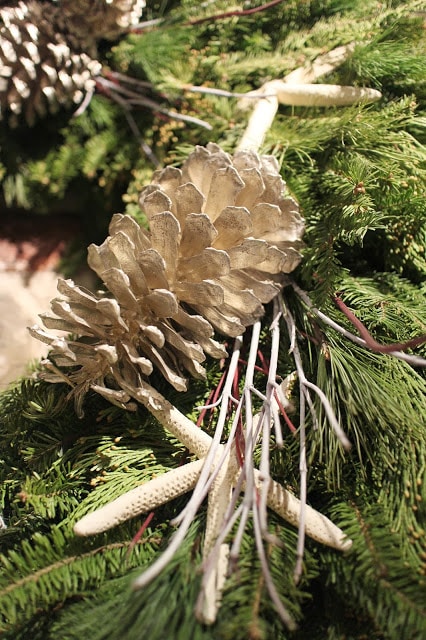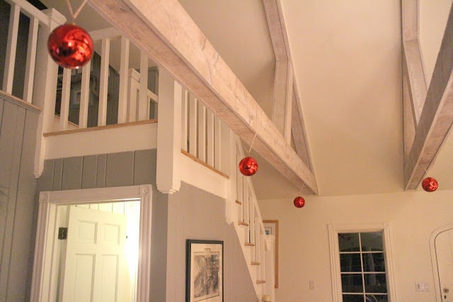 I hung large plastic ornaments from the beams. Super easy and adds a bit of Christmas without it feeling like the ceiling is falling on your head (which is why I’ve never liked the idea of putting garland up there).