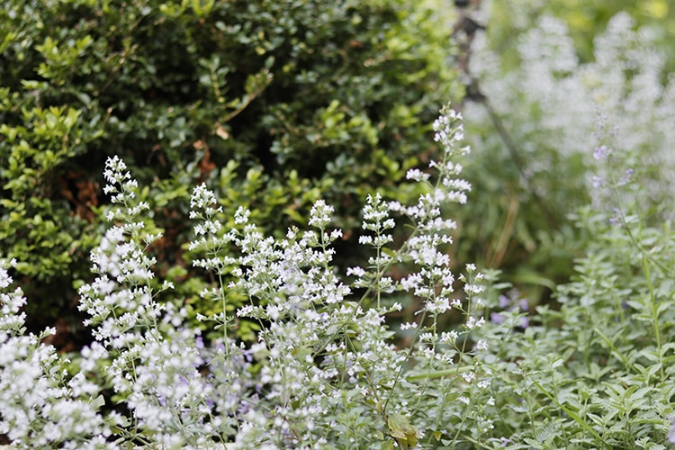 The flowers, which come in later summer and last for several weeks, are tiny little florets that extend nearly the length of the stem. I would say they remind me a little of baby’s breath except that I hate baby’s breath. They have the blueish-gray foliage typical of the nepeta family and the overall effect of the plant when in flower is a white haze. But closer inspection shows the flowers to have a tinge of pink of them.