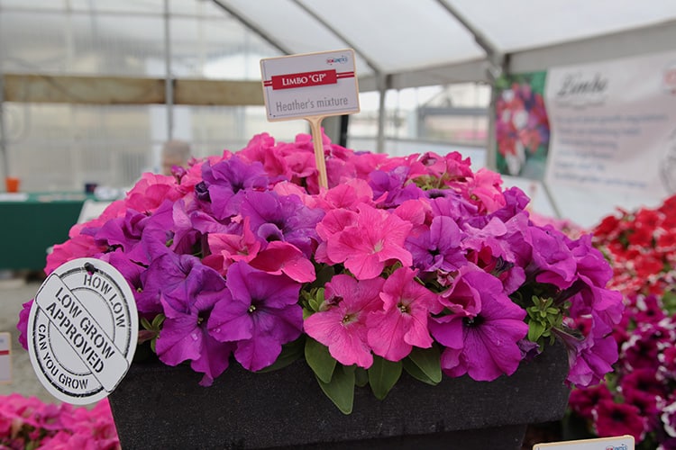Can you see the hearts? This is Surfina Heartbeat from Suntory.Some petunias are a more sophisticated palette, including this Potunia Cappuncino from Dummen Orange. This would be wonderful paired with purple foliage.Evening Scentsation is an All-American Selections winner from Takii Seeds with a light, pleasant scent. I just love the flower color.Dummen Orange shows this clear, clean yellow petunia in a combination basket.On the opposite end of this spectrum is a more moody but very interesting color combination on Selecta One‘s Headline Rose Star.I believe this striking petunia is Sweetunia Johnny Flame from Dummen Orange.The color of this blue-purple petunia from Dummen Orange was outstanding.Star patterns were popular including this Dekko Coral Star from Syngenta, which packed a huge color punch.These are Disneyworld colors. This low-growing mounding petunia from Hemgenics is designed for mass bedding displays. In the background you can see Hemgenics’ Picotee line of petunias in bright colors with white edges, which are huge sellers at Wal-Mart.Dotted petunias hit the market last year and were very popular. Breeders are working on make them more stable and offering them in different colors, including this Headline Starry Sky Burgundy from Selecta One.Westoff showed this Constellation Gemini petunia.If you love candy colors, this combination from Proven Winners might be up your alley. This is Supertunia Honey (a favorite of mine), Superbells Pink and a new gomphrena called Truffula Pink.Proven Winners also showed this interesting petunia called Supertunia Blue Skies.None of these Supertunias from Proven Winners are new, and neither is this combination, but it’s a good one: Supertunia Vistas Bubblegum, Silverberry and Fuschia. The Vista line is vigorous, so if you’re looking for a petunia that will get big, this is a good one.Kudos to Proven Winners on a fabulous display that featured this petunia wall made from wood crates.Sakata’s new additions to their SuperCal line (which are a combination of a petunia and a calibrachoa) were outstanding and a nice addition to the color range for petunias. From right to left they are Cinnamon, Caramel Yellow, French Vanilla, Bordeaux and Sunray.Sunray is fabulous with its detailed center. This is one to plant close where you can appreciate it.I saw so many petunias, but I think this may have been my favorite. This is Westoff’s Crazytunia Limy. It’s hard to show in a photo, but it is a true chartreuse, a color I can’t get enough of in the garden and plays so well with almost every other color.I don’t generally love star petunias, but this one was a great partner to Limy.Want something different? How about a climbing petunia? You read that right. These tall petunias, which require support, can reach nearly 6 feet in a season! These, including ‘Purple Tower’, are from Thompson & Morgan.And let’s not forget that even if you like the more typical colors, petunias are almost no-brainers in containers, like in this one from Benary.