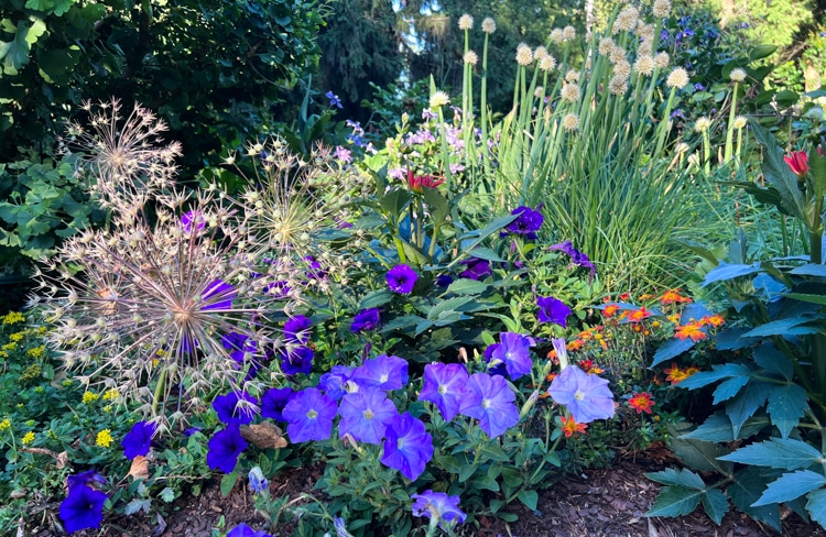 I used those same colors in a nearby bed right off the patio, bringing color to an area with dahlias and alliums, including the seedheads of Allium christophii.